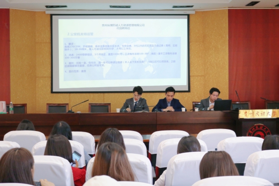 随后,贵州纵横黔诚人力资源管理有限公司招聘负责人向同学们介绍公司的概况、职业发展方向、人员需求以及选择该单位的理由等,并鼓励大家的加入。与此同时,面对就业的压力,同学们私下也做足了功课,对自身发展、企业发展前景、福利待遇等问题的有了自己的思量。毕业生在投递个人简介时,也更为谨慎了。在关心薪资和公司发展前景的同时,更为详细的咨询了合同签订的相关事宜,少了些盲目,多了些理性。