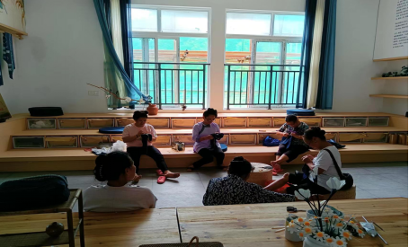 图为妈妈回家工坊的绣娘们正在刺绣