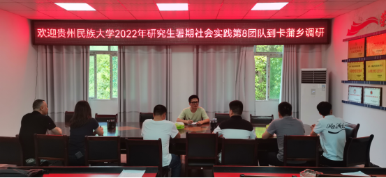 8月4日,实践团队到达卡蒲乡人民政府,卡蒲乡党委、政府对团队前来调研表示热烈欢迎。乡党委副书记组织召开了座谈会,会议指出,2021年7月民大研究生实践团队到卡蒲乡调研形成的《乡村振兴背景下贵州平塘卡蒲毛南族乡可持续发展调研报告》系统总结了卡蒲乡的脱贫攻坚样板案例,为卡蒲乡推进乡村振兴战略实施提供了对策建议,卡蒲乡党委、政府在制定具体实施方案时有了更多理论参考,为卡蒲乡可持续发展贡献了民大青春力量。会议还就卡蒲乡的产业发展进行了深入交流。