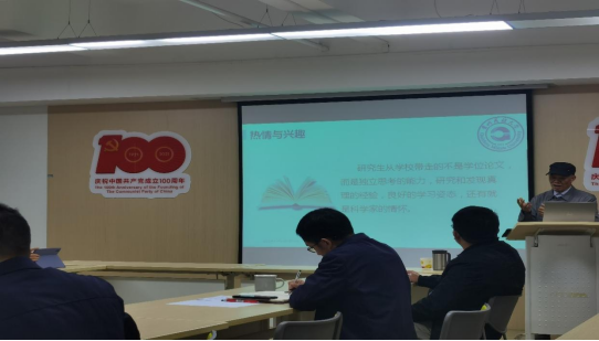 本次周会由杨昌儒教授作题为“研究生成长之我见”的讲座。杨昌儒教授从多年来培养学生的经验出发,总结出研究生的成长,包含三个方面:一、研究生之定位;二、学问之道;三、成功之秘决。最后是师生互动环节。