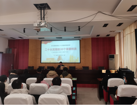 唐懈书记授课的主题为“党的二十大党章的30个重要修改”。唐懈书记分为四个部分为大家进行授课。首先,唐懈书记给大家讲解《中国共产党章程》的基本概述,“党章是中国共产党为实现党的纲领指定的基本法规,是党的各级组织和全体党员必须严格遵守的基本准则和规定”,党的二十大通过的党章修正案,共修改了50处,其中总纲部分修改了37处,条文部分修改了13处。其次唐懈书记为大家介绍党的二十大修改党章的重大意义,分别是:深入学习贯彻党的创新理论的需要;推进党和国家事业发展的需要;深入推进新时代党的建设新的伟大工程的需要;贯彻落实党的二十大精神的需要。随后,唐懈书记分享到党的二十大关于党章(修正案)决议,有利于坚持和加强中央集中统一领导、坚持不懈用习近平新时代中国特色社会主义思想凝心聚魄,增强党组织政治功能和组织功能、坚持以严的基调强化正风肃纪、坚定不移推进全面从严治党。最后,唐懈书记为大家详细讲解了党的二十大党章的30个重要修改,并对全院师生提出几点要求:一是要以学习宣传贯彻党的二十大精神为动力,深入理解其内涵;二是要把党的二十大精神牢记于心、实践于行,将二十大精神融入到工作、学习和生活中。