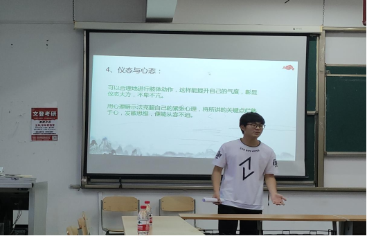 首先,由朱星旭同学为本次活动作主持工作,鼓励同学们积极分享自己的参会心得。朱星旭同学结合自身看法给同学们分享了五大经验:前期准备要熟、广、变;论文选题要小、稳、新;论文格式要规范;仪态与心态要好;掌握好答辩时间。