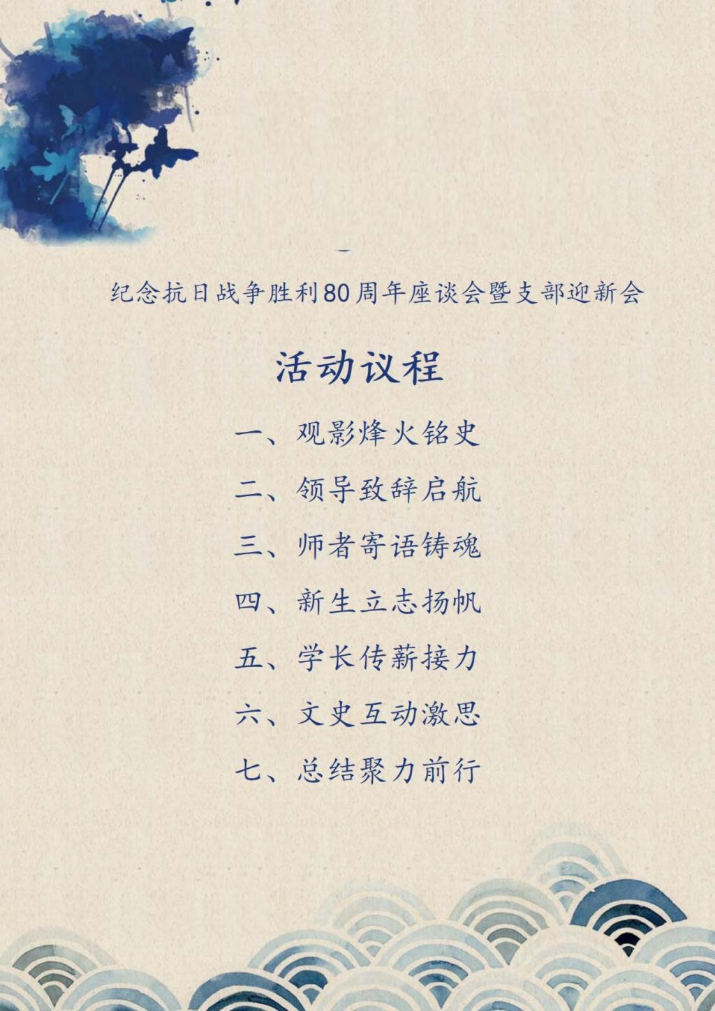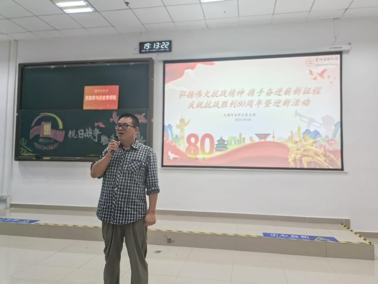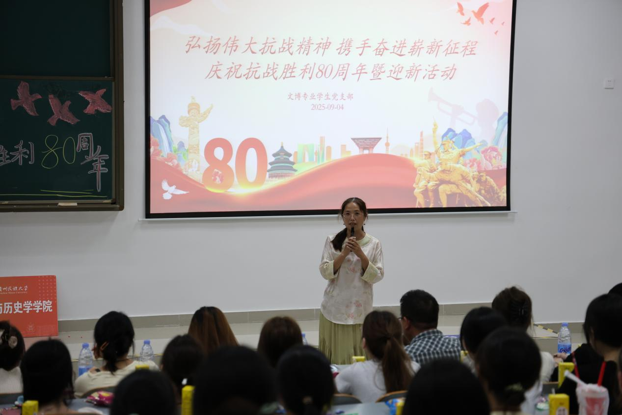2025年9月4日晚上,学院文博专业学生党支部主办的纪念抗战胜利80周年主题座谈会暨历史学系、文物与博物馆学系2025级新生迎新会在一教411教室隆重举行。活动融合历史记忆与青春活力,引发师生热烈反响。学院副书记李浩老师、历史系主任高照晶老师、文博支部组织委员王涛老师、辅导员刘欢歌老师莅临现场,优秀学生代表翁建平博士、王紫寒硕士、贺硕博同学共话担当,2024级文博班杨珺涵同学主持。