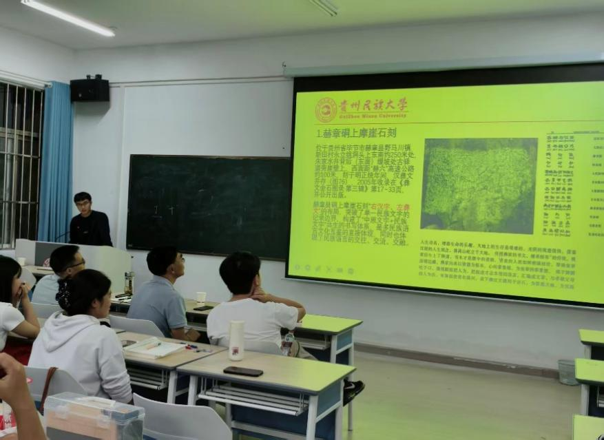 汇报人张绍平同学详细介绍了团队在叶成勇老师带领下,于2025年7月至8月间,分两次对铜仁市9个县(市、区)进行的深度田野调查。他们不仅完成了对2个传统村落、4个建筑群、60多个文物点以及多个文化场馆的考察,更搜集了家谱、契约文书等珍贵民间文献,为区域文化研究奠定了坚实基础。汇报重点呈现了思南府文庙、松桃麦地禹王宫、印江新业与盘石土司衙门旧址等典型案例。思南府文庙作为“改土归流”政策的物质见证,其前身为土司府邸的沿革,生动揭示了中央治理与地方文化的互动。麦地禹王宫道光五年的“永古不朽”碑,则以其上清晰的39位参会者姓名,为还原清代苗汉社群结构与民族关系提供了弥足珍贵的实物证据。团队不仅关注宏大的历史叙事,更对汪元宝墓、“中和”摩崖、吕大器题词摩崖等各类遗存进行了精细记录与价值挖掘。他们既总结了印江合水造纸“以用促保”、思南古建“空间共享多元价值”等成功经验,也尖锐指出了德江“黔中砥柱”石刻因电站蓄水淹没、文昌阁旁关联建筑未纳入保护等现实困境,引发了大家对文物保护与现代化发展矛盾的深思。