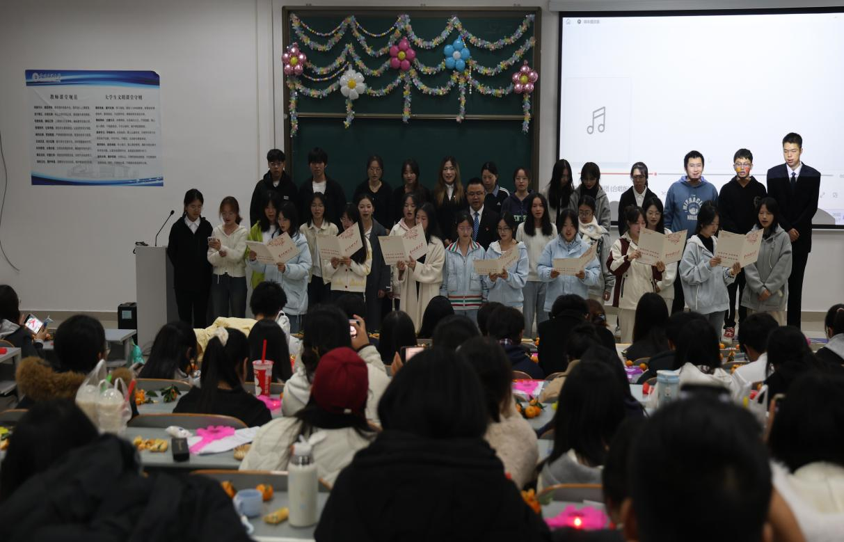 晚会在25级文化产业管理班的激昂合唱中正式拉开序幕。同学们身着整齐服装,精神饱满、意气风发,以嘹亮又饱含深情的歌声演绎经典曲目。朴素的歌词里,藏着穿越时空的不变时代真理;激昂的旋律铿锵有力,响彻一号教学楼的每一个角落。歌声既生动唱出了中华民族从站起来、富起来到强起来的伟大飞跃,更真挚展现了新时代青年学子对党和国家的赤子情怀与忠诚担当,瞬间点燃现场氛围,为整场晚会奠定了昂扬向上的基调。