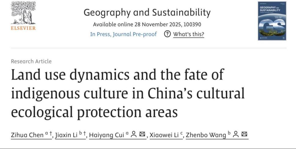 为第一单位,在环境科学领域权威期刊《Geography and Sustainability》上发表题为《土地利用变化与中国文化生态保护区原生态文化保护》(Land use dynamics and the fate of indigenous culture in China's cultural ecological protection areas)高水平学术研究论文。该研究标志着团队在人地关系与文化遗产保护交叉研究领域取得了持续性、系统性的创新成果。