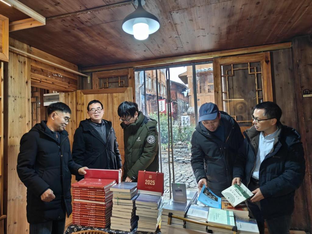 西江苗寨教学实践基地进行实地考察。在学院、地方党委政府、景区公司的大力支持下,该基地于2016年创办,长期致力于民族文化的挖掘、研究、传承与产学研一体化发展,同时开展民族文化旅游研究与人才培训工作。团队先后参观了基地内的西江书局与西江讲堂。在西江书局,调研人员浏览了基地多年来收集、整理及出版的丰富地方文献、学术著作与文化读物,对其在文献保存与知识传播方面所做的扎实工作表示赞赏。在西江讲堂,基地学生陆群艳向调研组详细汇报了基地自成立以来的发展历程、主要开展的田野调查项目、文化交流活动以及服务地方社会的具体实践,展现了其连接高校学术与地方田野的桥梁作用。
