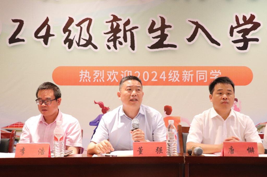 于群学讲堂举行2024级新生入学教育暨军训动员大会。参加本次大会的有董强副校长、宣传部部长、学院院长、唐懈书记、李浩副书记、叶成勇副院长、郭国庆副院长,周永健教授、龙胜阳教授、辅导员聂开吉老师和戴钰均老师以及2024级全体研究生和本科生。