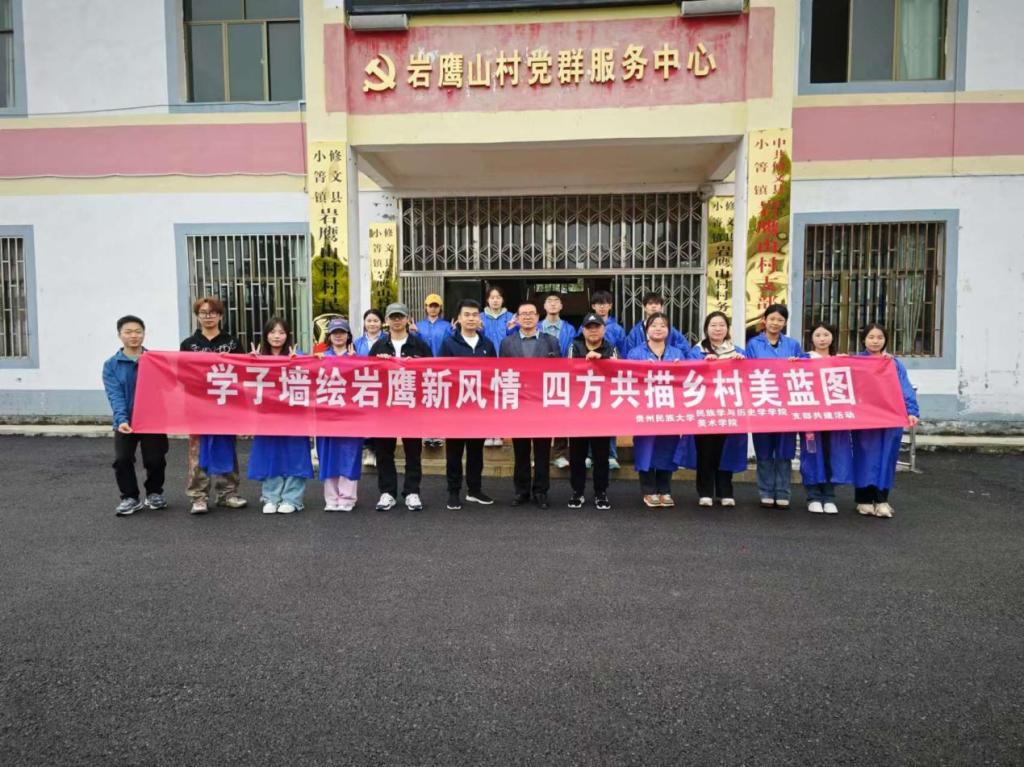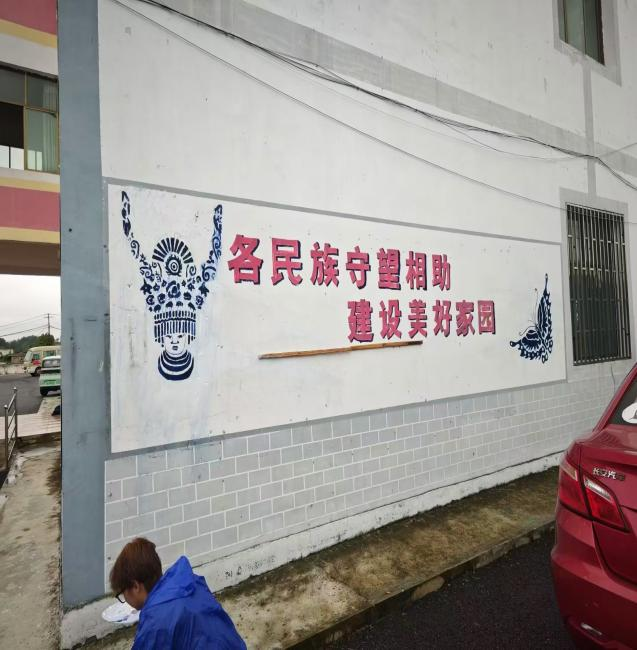 党委副书记李浩同志和美术学院巫峻老师的带领下,前往修文县修文县小箐镇岩鹰山村绘制墙画。抵达岩鹰山村后,师生们在小菁镇组织、宣传、统战委员王永林的带领下,对需要绘制强化的墙面进行实地调查,并针对小菁镇的民族文化、民族服饰等问题进行访谈,随后根据村情制定了绘画方案。