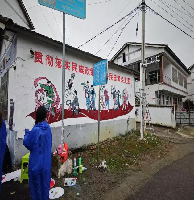 为了顺利完成预期目标,为鹰岩山村美丽乡村建设添砖加瓦,李浩副书记和美术学院巫峻老师冒着大雨前往绘画现场,为绘画的学生及时提供专业的指导,并根据墙绘工作进度对计划进行调整。